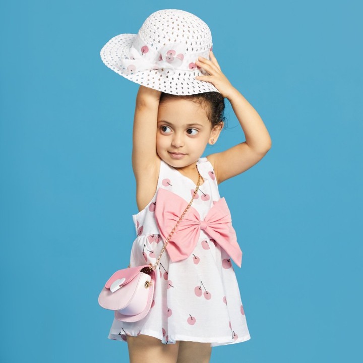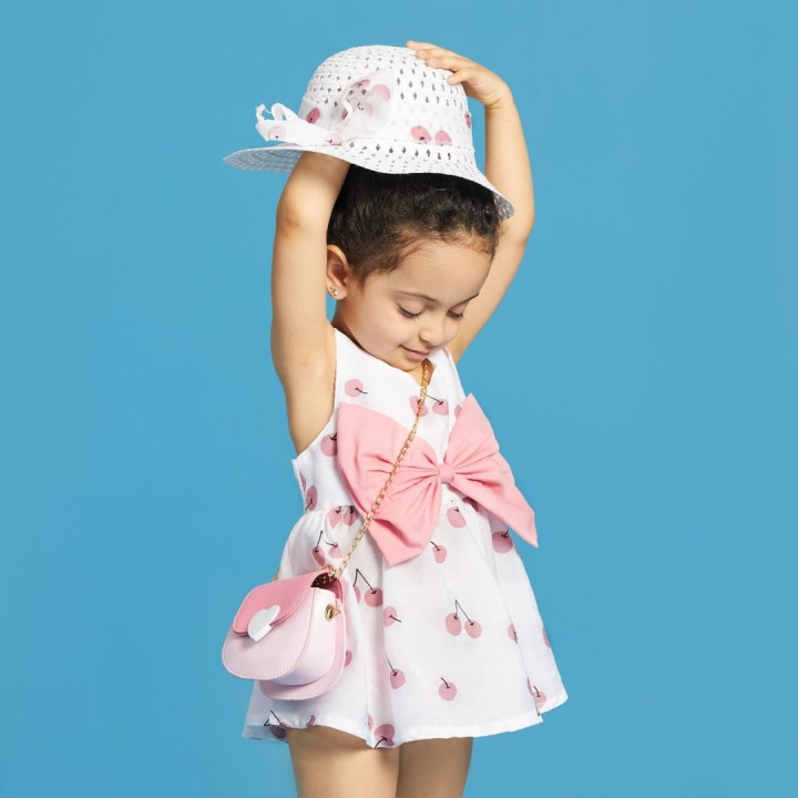 Cherry Allover Bow Decorative Dress And Hat Set Pink