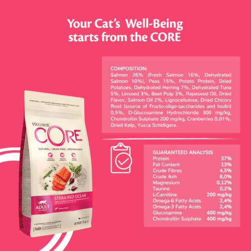 Wellness CORE Sterilised Ocean is designed to support Sterilised cats' needs & support a Healthy Skin & Shiny Coat thanks to a guaranteed level of Omega 3 & 6 Fatty Acids from Salmon oil.
