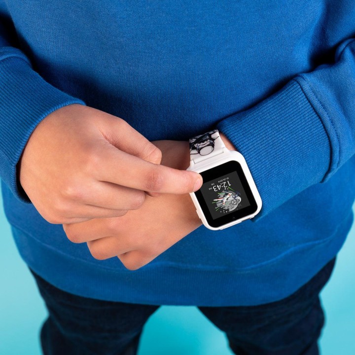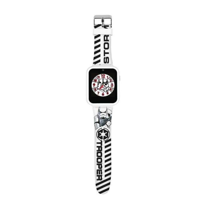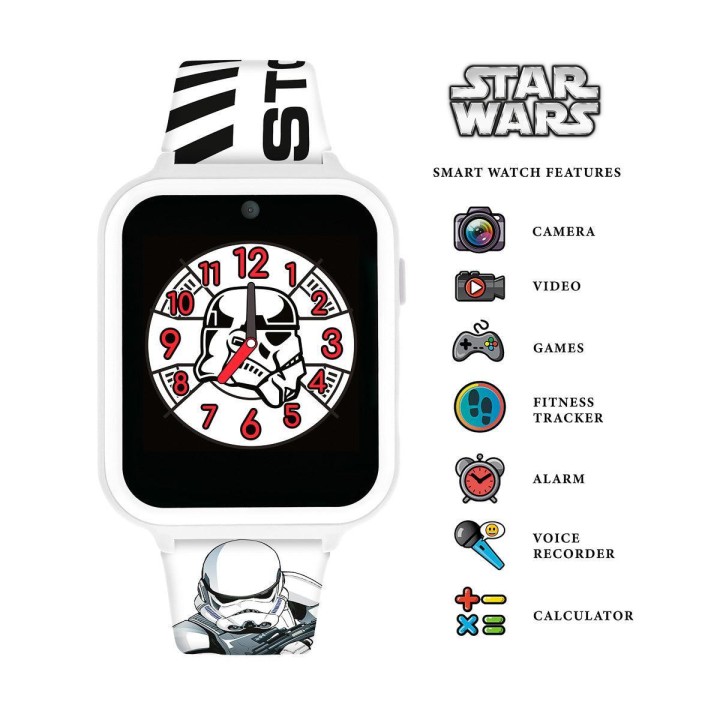 Disney Star Wars White Stormtrooper Smart Watch with Printed Silicone Strap STM4353 Disney Star Wars interactive smartwatch with a printed soft silicone strap. The watch features: 10 watch faces (5 analogue and 5 digital), 3 wallpapers, a selfie photo/video camera, games, a fitness tracker, alarm/stopwatch/timer, voice recorder, calculator, device settings. USB cable supplied for charging and data download. Packaged in an official branded gift box and comes with one year guarantee. Includes: Touch screen, selfie photo/video camera, games, fitness tracker, alarm/stopwatch/timer, voice recorder & calculator. Suggested age suitability 3 years and upwards.EU Warning: Not suitable for children under the age of 3 years due to small parts which could cause a choking hazard.