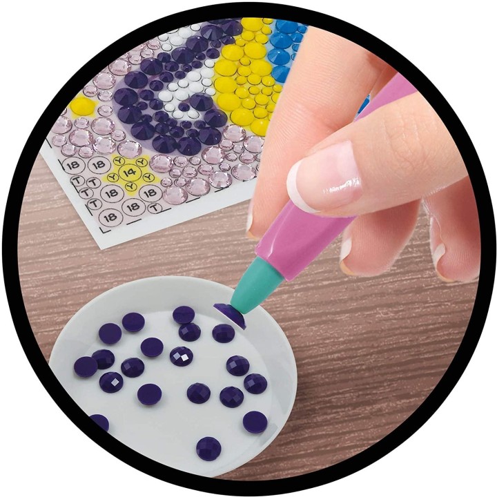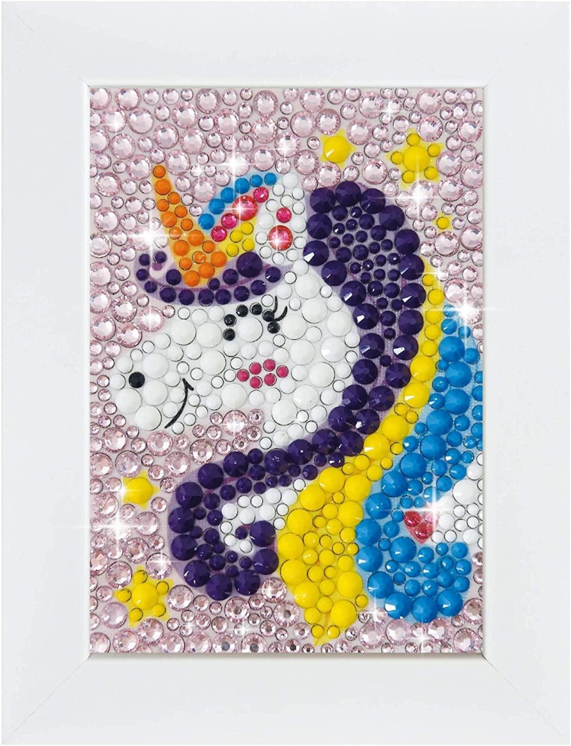 BUKI France DP002 Be Teens Glitters - Unicorn Stick the diamantés on the matching numbers, letters or symbols to create a unique unicorn painting! Use the wax tip stylus to easily pick up the diamantés, and place them on the surface of the self-adhesive board. 3 sizes and 2 types of diamanté: matt or shiny!Once your painting is finished, place it in the beautiful white wooden frame provided to decorate your house! The frame is 10x14 cm. A "Unicorn" diamonds painting adapted for children Find the matching number and letters and place the strass on the self-adhesive board Includes: a stylus to help you pick the strass, a lot of diamantés of 3 different sizes Wooden frame included Suggested age suitability 7 years and upwards. EU Warning: Not suitable for children under the age of 3 years due to small parts which could cause a choking hazard.
