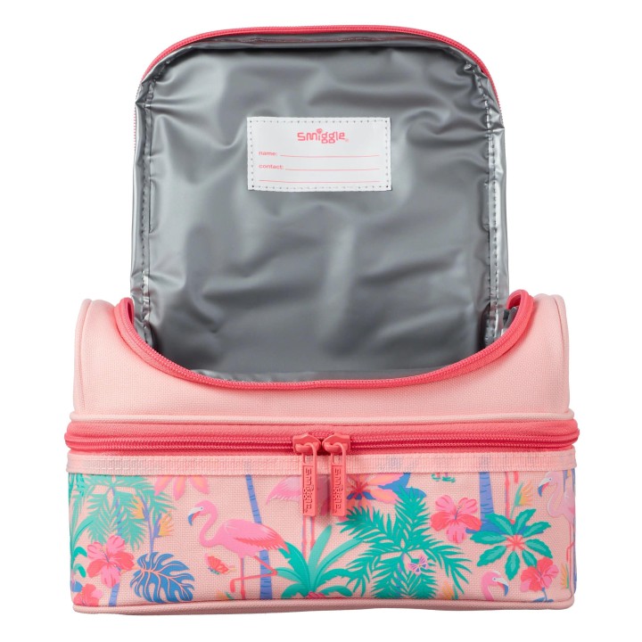 SMIGGLE Neat Double Decker Lunchbox - Coral This classic double-decker lunchbox from our Neat collection is perfect for lunchtime! It has two tiers of storage so you can separate all of your snacks. The lining is BPA free and food-grade safe. Carry handle BPA-free and food-grade safe Padded Insulated Lining Double Zips W 24.5cm x H 15cm x D 15.5cm Wipe clean with a damp cloth Outer: Polyester; Polyurethane Inner: PEVA Suggested age suitability 3 years and upwards.EU Warning: Not suitable for children under the age of 3 years due to small parts which could cause a choking hazard.