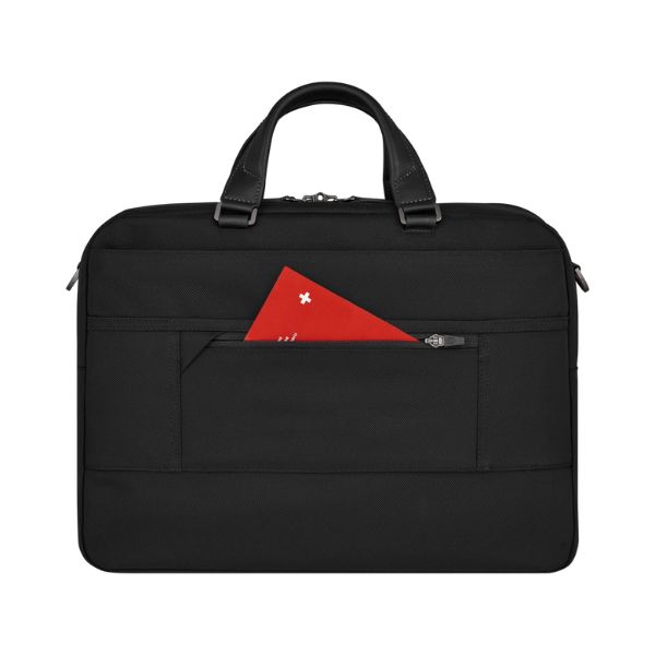 Embrace timeless elegance with the Mythic Compact Briefcase, crafted from premium materials in classic black. It features protective feet with an Alox pattern, interlocking zippers with a leather pull and a luggage cart pass-through with a scratch-resistant pocket. The interior includes an elastic 14" laptop compartment and a padded 11" tablet pocket, ensuring your devices are secure. With an adjustable and removable shoulder strap and genuine leather handles, this briefcase blends style and functionality for business needs.