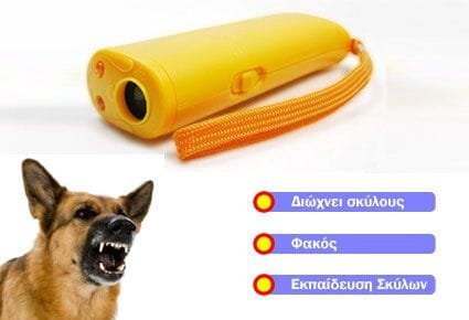 Πόσες φορές έχετε βρεθεί στην δύσκολη θέση να απειληθείτε, από ένα σκύλο, άγριο ή όχι; Την ώρα που οδηγάτε μοτοσικλέτα ή ποδήλατο, που κυνηγάτε, που περπατάτε ή οποιαδήποτε υπαίθρια δραστηριότητα, δεν έχετε συνέχεια το μυαλό σας, μήπως σας κάνει επίθεση ένα σκυλί; Αυτό το πρόβλημα πλέων είναι παρελθόν, με τη συσκευή απώθησης σκύλων.\n\nΦορητό απωθητικό σκύλων με όχι φιλικές διαθέσεις. Εκπέμπει υπέρηχους πολύ ενοχλητικούς για τους σκύλους και τις γάτες και με τον τρόπο αυτό απομακρύνονται.\n\n\nH συσκευή υπέρηχων έχει 3 χρήσεις:\n\n\n - Την απομάκρυνση επιθετικών σκύλων\n - Εκπαίδευση σκύλων\n - Φακός με 2 led