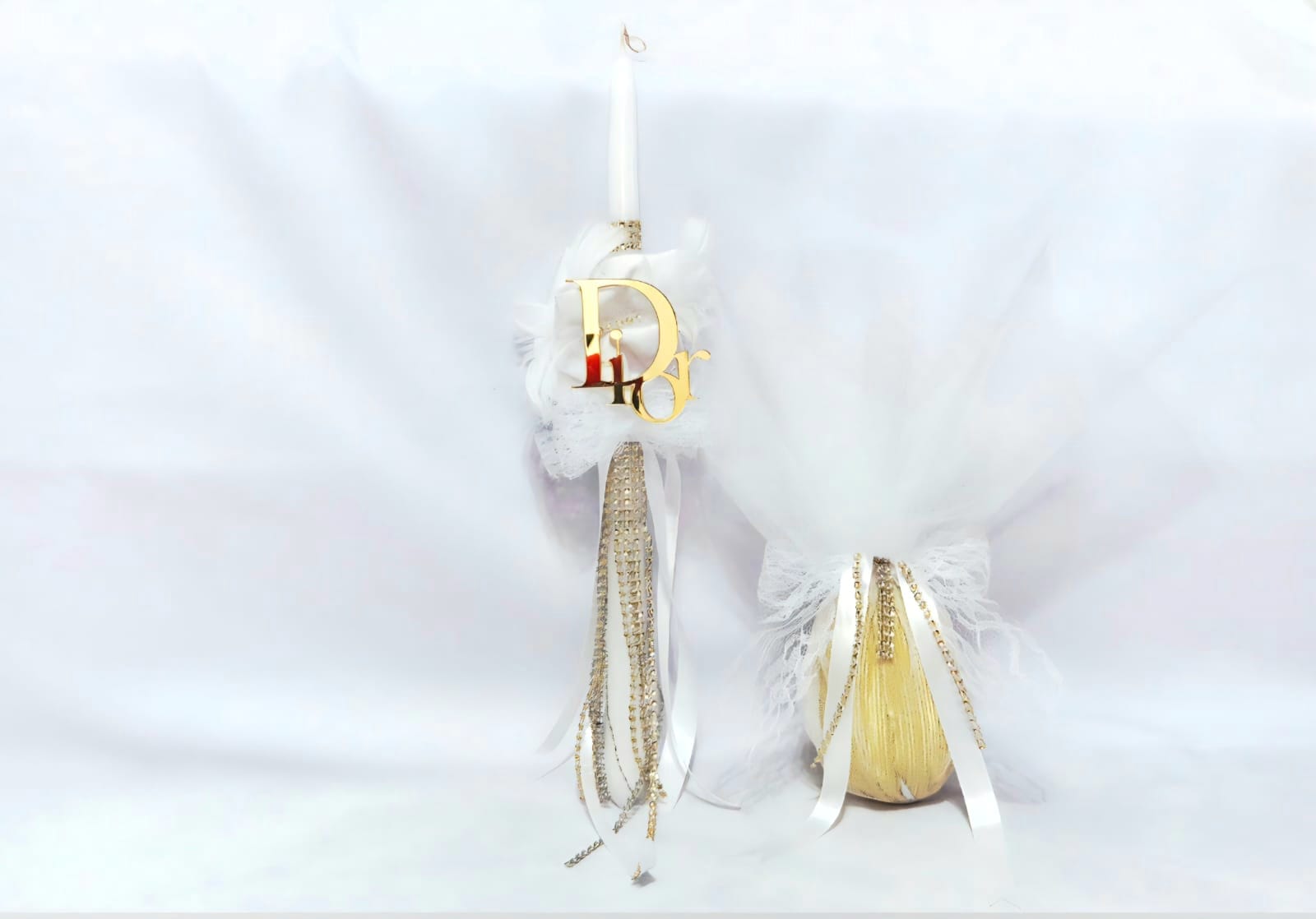 Easter candle lambada and chocolate egg in white and gold, adorned with rhinestones, feathers, and Dior-inspired decorations.