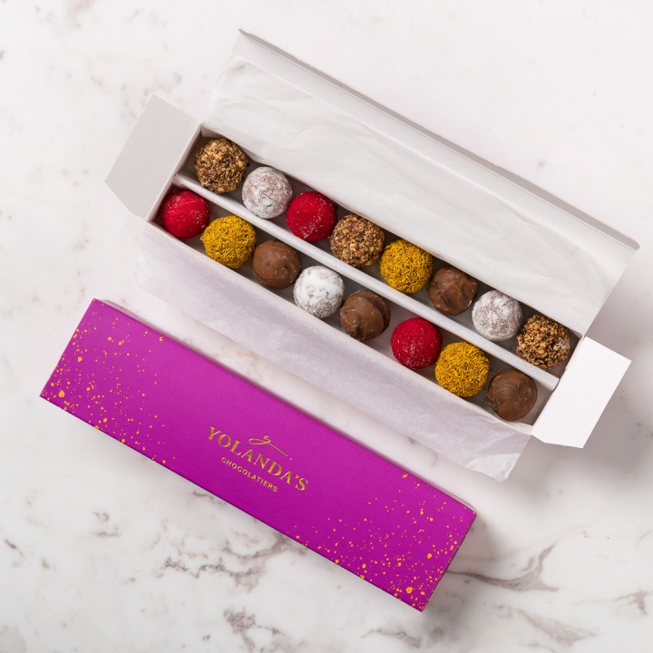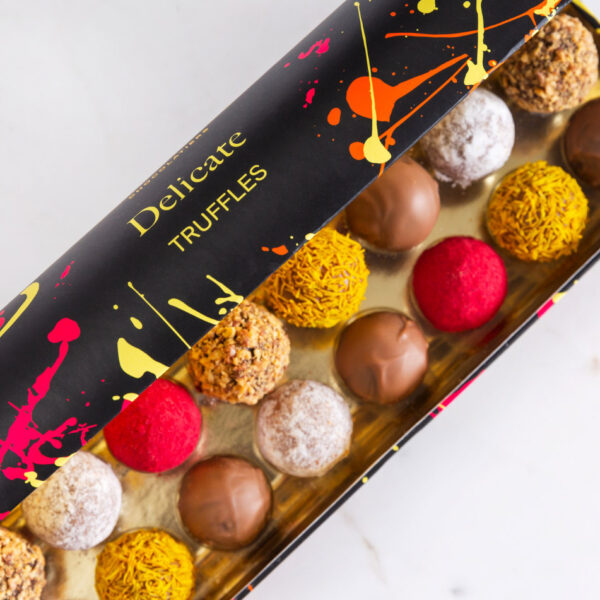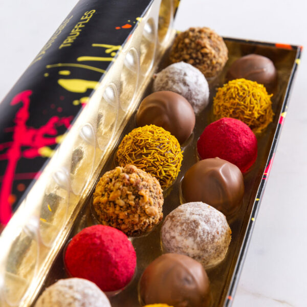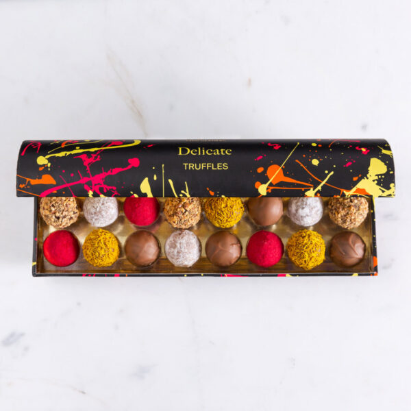 Our new truffle box is the perfect gift to impress your friends, collegues or loved ones. Our prestigious gift box complements our artisanal truffles, to perfection. Each truffle is handcrafted with delicate precision, making every bite a fresh experience. Treat yourself or someone close to you with a gift of 16 truffles.