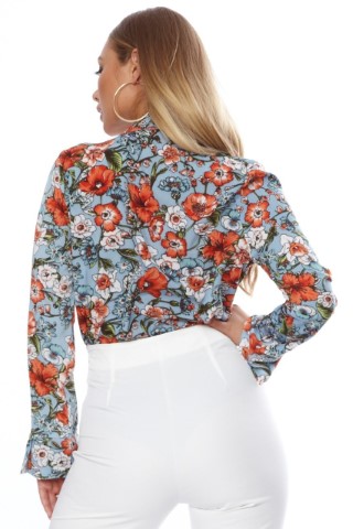 Floral Blue V Neck Long Sleeve Bodysuit - Size Xs - Sky Blue
