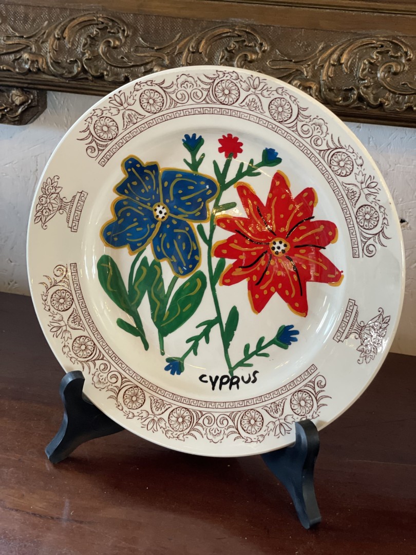 Vintage hand-painted ceramic plate with floral design and “Cyprus” inscription, circa 1970s. \n \nSpecial Aspect: \n \nThe plate’s bright, raised hand-painted colors make it feel almost like a piece of wall art. \n \nEstimate Era: \n \nCirca 1970s This vintage ceramic wall plate features a hand-painted design with two bold flowers—one red and one blue—surrounded by a decorative maroon border. The word “Cyprus” appears beneath the floral arrangement, making it a charming souvenir piece. The plate includes a stamped mark on the back and was likely produced around the 1970s. Its vivid colors and symmetrical floral artwork make it an eye-catching decorative item for kitchens, living spaces, or wall collections. The plate comes with a display stand, ready to showcase. \n \nEstimate Era: \n \nCirca 1970s \n \nStorytelling: \n \nThis plate once sat proudly in a sunny home, bringing color to everyday moments. Its hand-painted blooms still brighten any space they’re placed in.