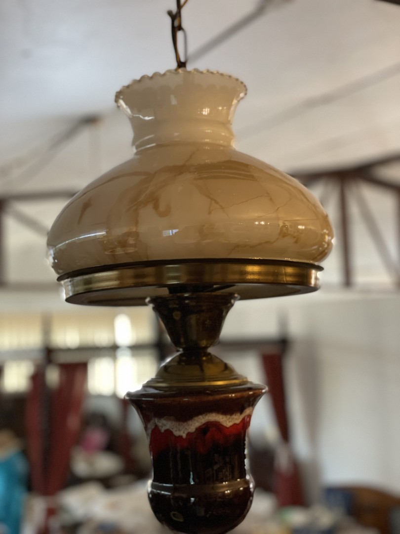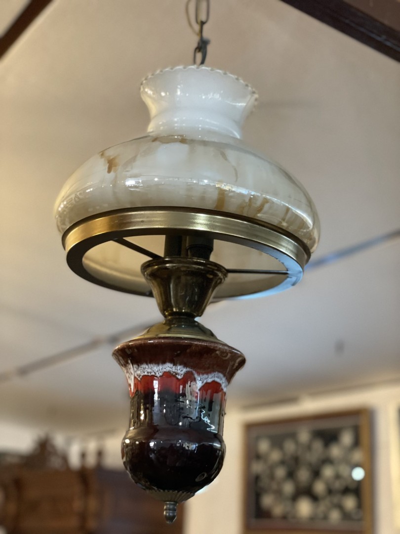 Illuminate your space with the timeless charm of this vintage hanging vintage lamp. Featuring a beautifully crafted ceramic base with a rich, deep glaze and intricate detailing, this lamp is topped with an elegant glass shade that diffuses light softly, creating a warm and inviting ambiance. Illuminate your space with the timeless charm of this vintage hanging vintage lamp. Featuring a beautifully crafted ceramic base with a rich, deep glaze and intricate detailing, this lamp is topped with an elegant glass shade that diffuses light softly, creating a warm and inviting ambiance. The lamp hangs from a sturdy metal chain, making it a perfect addition to any rustic, farmhouse, or vintage-inspired decor. Ideal for collectors or those looking to add a unique, historical touch to their interior lighting. This piece is not just a functional light source but also a stunning decorative item that adds character and a sense of nostalgia to any room.