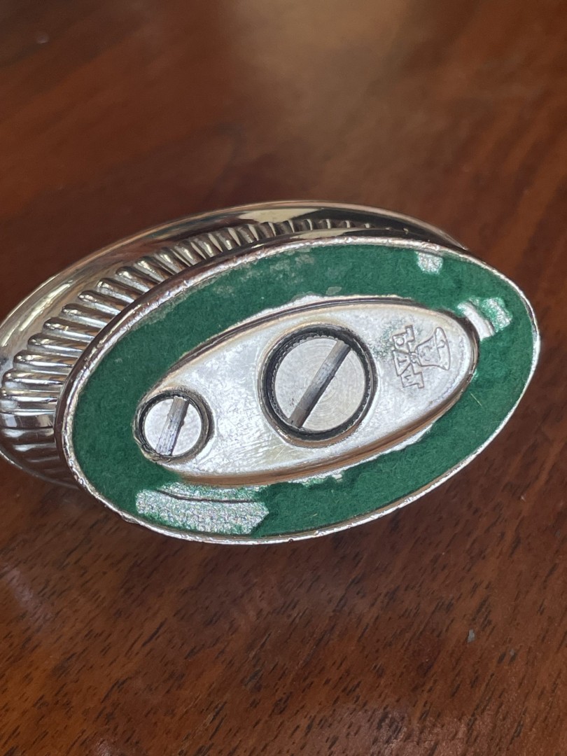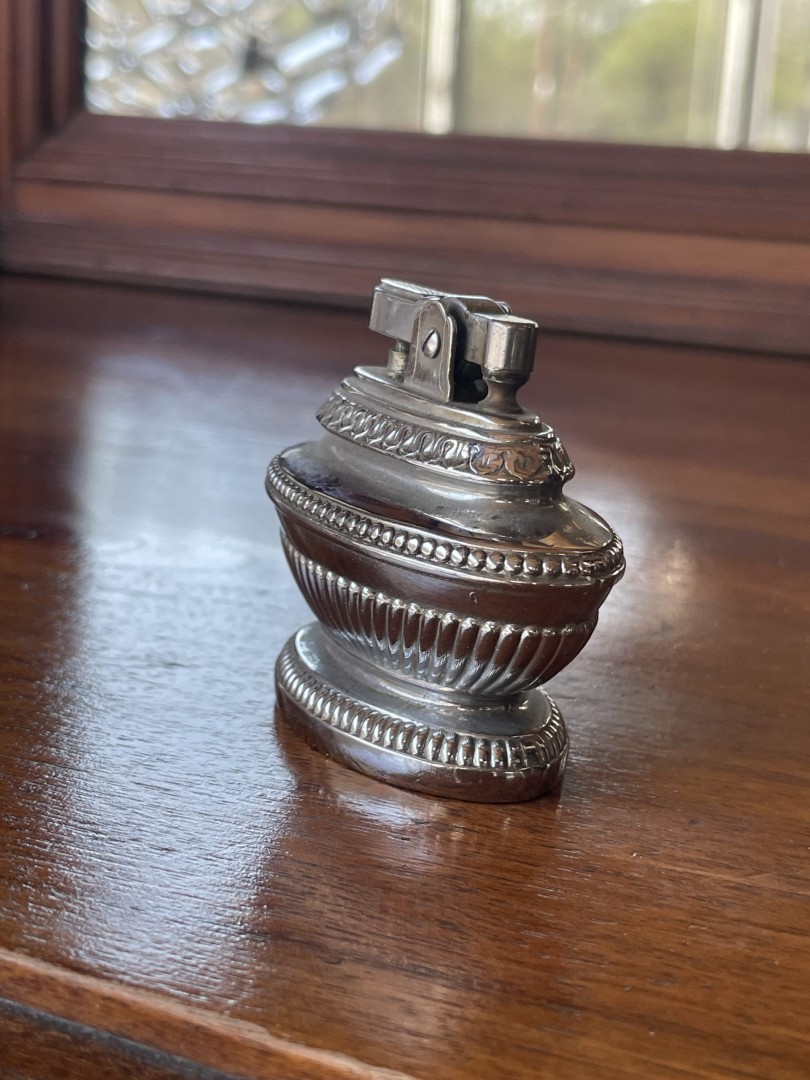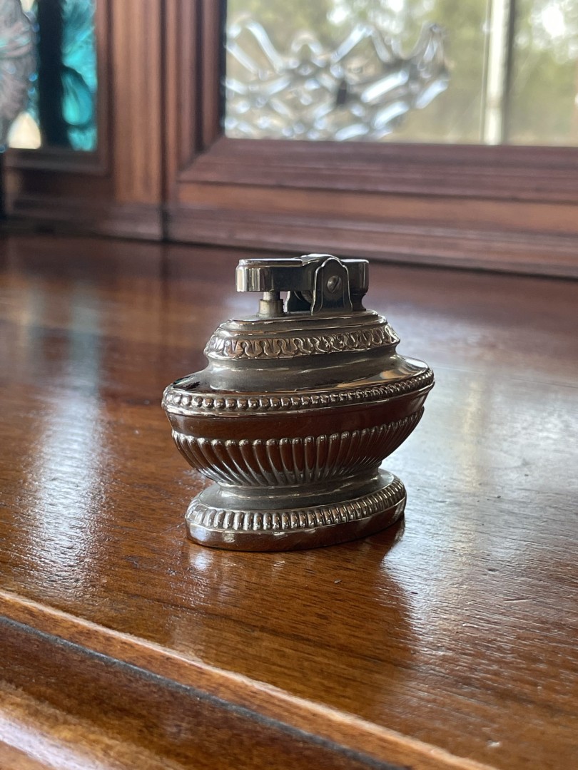 Vintage Ronson silver-plated table lighter with Art Deco detailing, made in England, circa 1940s. Elegant and collectible. \n \n💎 Unique Feature \n \nOriginal Ronson England mark on base with green felt pad. \n \n🕰️ Estimated Era: \n \nMid-century, circa 1940s This vintage Ronson silver-plated table lighter is a true collector’s gem from the mid-20th century. It blends everyday function with timeless Art Deco elegance. Crafted in England, it features a fluted body, ornate borders, and a lustrous silver finish. The oval base adds stability, while the detailed craftsmanship reflects Ronson’s high-quality standards. The underside carries the iconic Ronson logo, confirming its authenticity. \n \nTable lighters like this one were staples in stylish homes from the 1940s to the 1960s. They served as both practical smoking tools and striking decorative accents. Many graced living rooms, libraries, and gentlemen’s lounges. This piece will appeal to vintage lighter collectors, Art Deco enthusiasts, and anyone who values fine craftsmanship. \n \nThe lighter mechanism remains complete. You can refill it with lighter fluid, make service and enjoy it as intended. The silver plated  surface shows only light patina, adding depth to its character. This is more than just a lighter—it’s a piece of design history that deserves a place in any refined interior. \n \n🕰️ Estimated Era \n \nCirca 1940s \n \n💬  Storytelling \n \nPicture this lighter resting on a polished bar cart, bathed in warm evening light. Its distinctive click might have once marked the start of lively conversations, after-dinner cigars, or celebratory toasts. It carries the charm of a time when even the smallest objects held beauty and meaning. \n \n👉🏼 Explore more options here