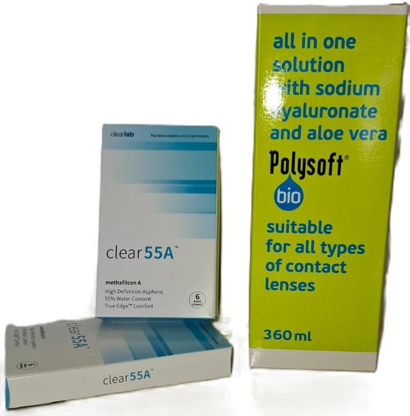 2 Boxes Clear 55A (12 Pack) +1 Polysoft Bio Lens Solution 360Ml - Monthly Contact Lenses - Power = -7