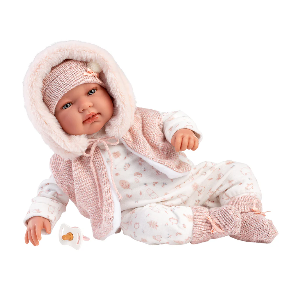 Tina is one of our older newborns. She has blue eyes and is bundled up in her fuzzy hooded vest and pink onesie. She has a soft body with vinyl limbs, and if you squeeze her tummy, she'll cry and call for Mom and Dad.Not recommended for children under 3 years of age. Contains small parts that may be swallowed or inhaled.Product details
