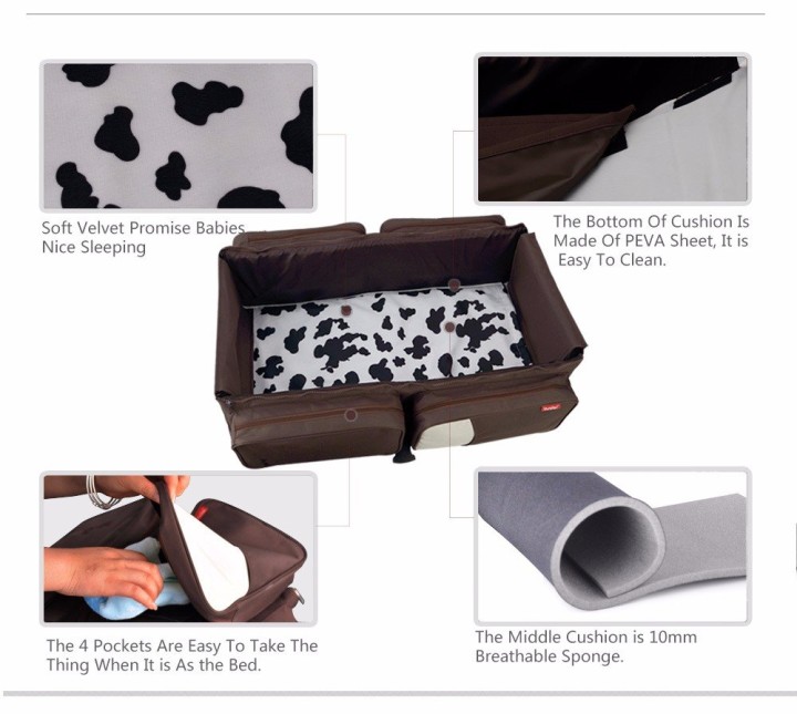 This is a Multifunction diaper bag, it can be used as a normal diaper bag and a travel cot bag for baby when outing, can also be used as a Bassinet and Diaper Change Station. Brand Mamababy